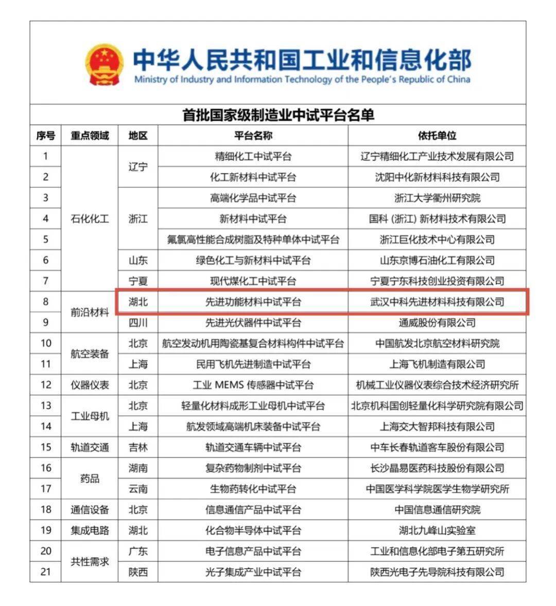 湖北日报客户端讯(通讯员陈鹏飞、高豪远)近日,工业和信息化部公布首批国家级制造业中试平台名单,位于军山新城的武汉中科先进材料科技有限公司先进功能材料中试平台成功入选。